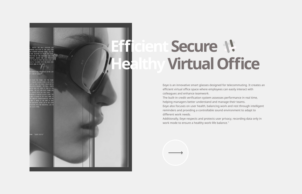 EEye smart glasses are designed to enter virtual office space, display work progress, control volume, work credit status, etc., enhance team cooperation and work efficiency, and provide health reminders and sound control to maintain users' work health. Real-time credit verification systems allow managers to assess employee performance more accurately. The skills developed in the project include user experience design for smart devices, data recording and analysis, interactive interface design, and the use of AI tools to generate design sketches. In particular, the in-depth understanding of remote work needs has strengthened the team's ability to analyze user needs and respond to design.